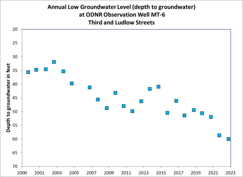 The Buried Valley Aquifer system beneath Dayton is a critical resource, not only for drinking water but also for cooling systems and river health. However, data from observation wells maintained by the Miami Conservancy District (MCD), U.S. Geological Survey (USGS), and the Ohio Department of Natural Resources (ODNR) show troubling trends.