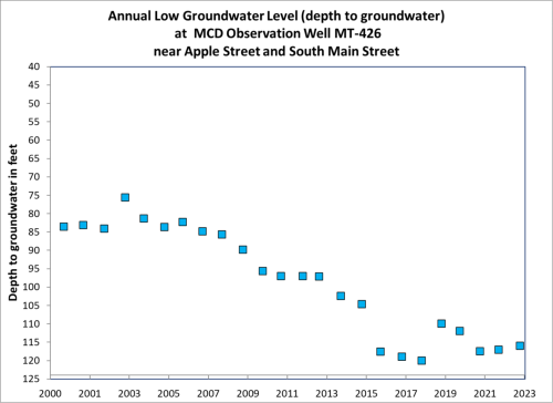 Groundwater levels in some downtown areas have dropped significantly over the past 15 years. Observation wells MT-6 and MT-426, which have records dating back to the 1940s, reveal a steady decline in annual low groundwater levels, typically recorded in September or October, after the summer cooling season.