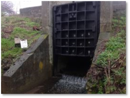 Flap gates are typically mounted at the end of small storm drains. Almost all of MCD's flap gates are round. Most measure between 4 and 12 inches in diameter. A few are as large as 36 inches. Two in Hamilton are square and measure 96 inches per side. Flap gates do not require manual operation. They hang from a top hinge and remain closed except when pushed open by flowing water in the drain pipe. When the river rises enough to push against the gate, the hydrostatic pressure seals the gate, preventing it from opening.